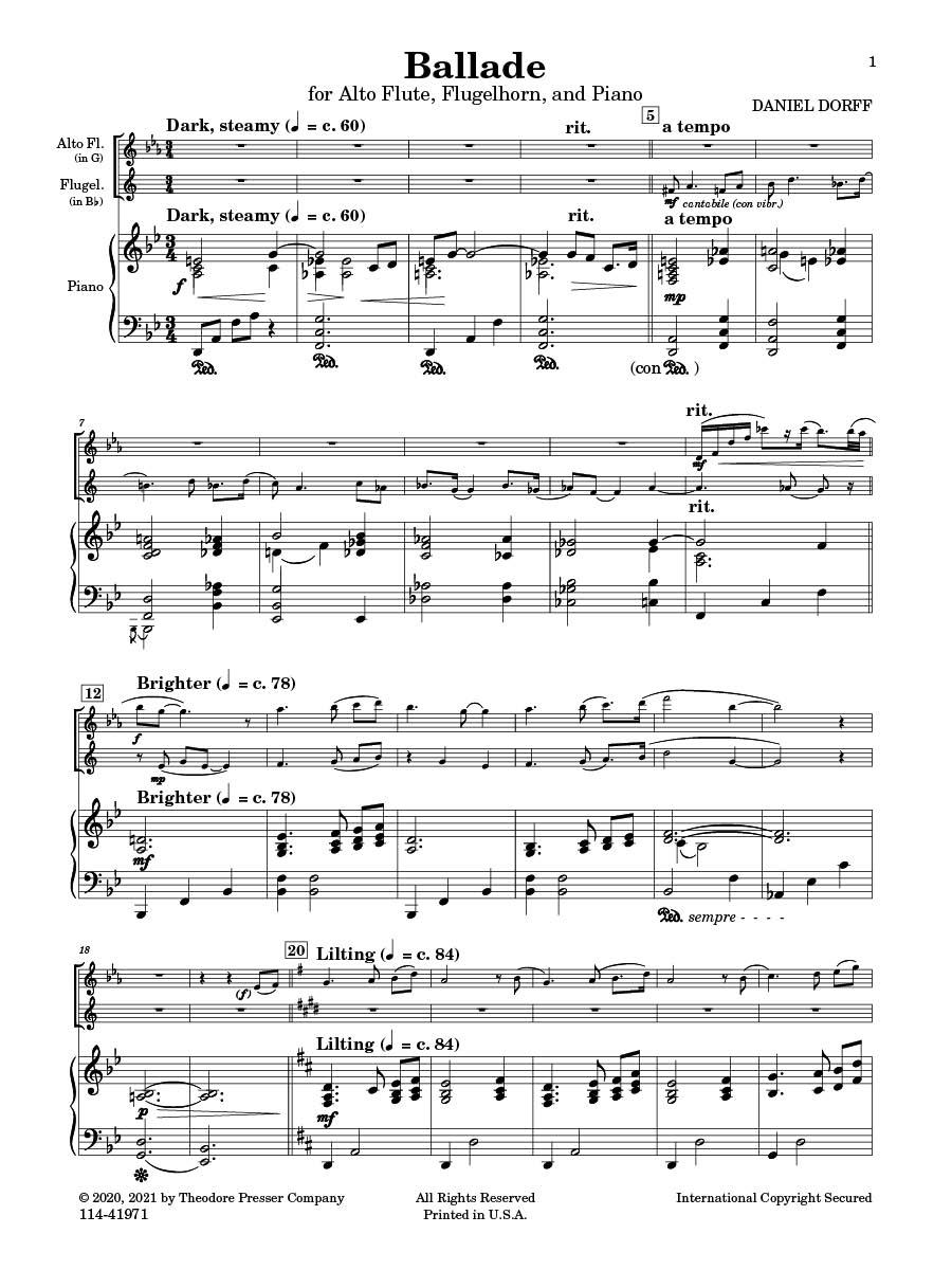 PROGRAM NOTES This warmly eccentric piece was the conception of flutist Therese Wacker who has performed many of my flute works and recorded Sonatine de Giverny on CD. In late 2017, Terri asked if I'd be interested in a commission to write her a Ballade to play on Alto Flute along with her IUP colleague Kevin Eisensmith on Flugelhorn, plus Piano. The style should be uniquely fitting for that combination of instruments, and about 6-8 minutes.