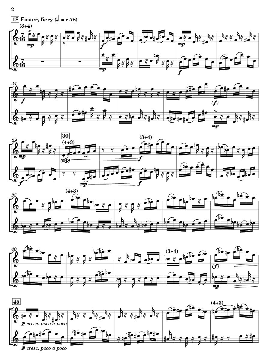 "... an interesting fantasy based on a very well-known work. It consists of two sections based on source material from the Allemande movement of the Bach Partita (BWV 1013). Dorff uses rhythm and texture to weave a new work from small snippets of the original tune. The new composition in its own compelling way, is not unlike a ransom note created by cutting letters from a magazine. The first section, "Moderato, with Baroque lightness" incorporates an imitative texture and style reminscent of Bach's organ works, and the melody of the Allemande from is clearly recognizable, although there aren't any really direct quotes. The second section, "Faster, fiery," in 7/16, is driven by its asymmetrical meter into a rhythmic, Latinesque dance that maintains the perpetual motion of the original music while discarding some of the gravitas inherent in the Partita. Where Bach's Partita is solemn, this duet is joyous, angular, and on the move. It is an exercise in carefully controlled chaos of which Bach himself might approve!"